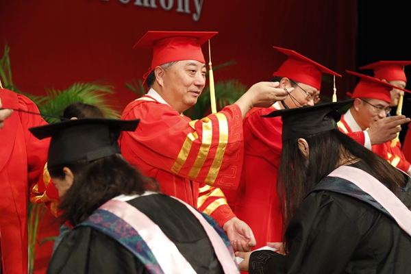 在下午的学士学位授予仪式上,校领导班子成员、教师代表为获得学士学位的学生正冠拨穗、颁发学位证书并合影留念。