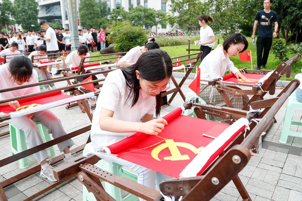 仪式上,100位师生在经历了近100天的绣制后,在今天为100面党旗进行了收针。
