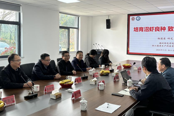 浙江国梁水产科技有限公司是我校生命科学学院杨国梁老师在安吉开设的创业型企业。杨老师代表公司和科研团队对学校一行表示热烈欢迎,并详细介绍了公司发展历程,重点包括虾苗技术研发、淡水产品苗种养殖、销售,技术服务全产业链等建设情况。