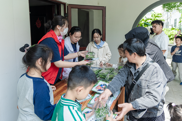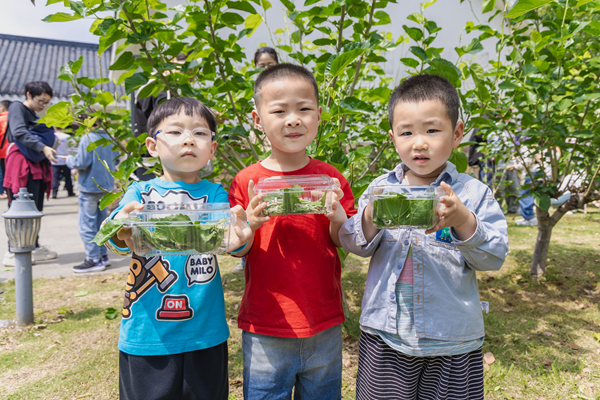 在桑叶采摘体验区,春蚕饲养劳动教育的学生志愿者们亲自示范,手把手教导家长和孩子们正确的采摘桑叶方式,并普及蚕宝宝食用桑叶的特殊要求,以及不同龄期的蚕宝宝对桑叶成熟度的不同需求等知识。